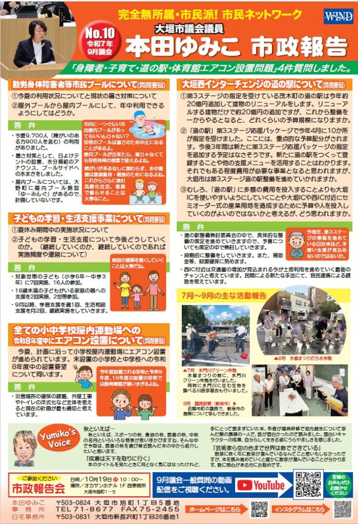 大垣市議会議員 本田ゆみこ氏の市政報告No.10をご案内します。