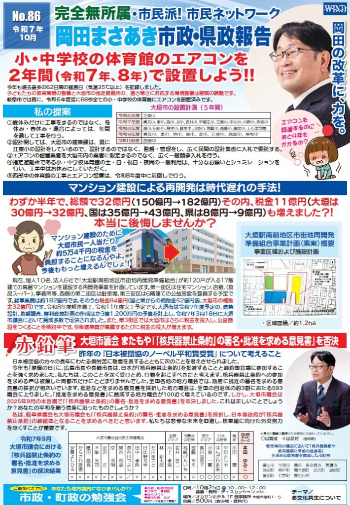 また、市民の皆さまに知っていただきたい大垣駅前旧ヤナゲンビルの総事業費の増加、大垣市議会による『「核兵器禁止条約」の署名・批准を求める意見書』の否決なども記載しています。ぜひ、余すところなくお読みいただければ幸いです。(拡大・印刷される場合は、青色文字の86_2510市政報告_oをクリック下さい。)